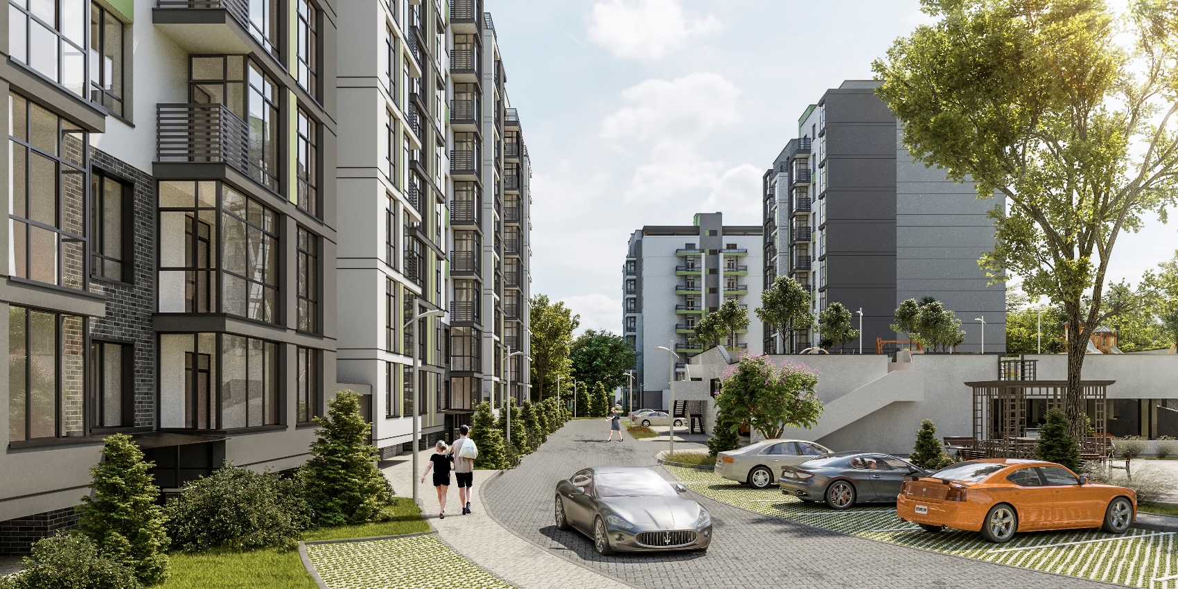 Новий сучасний житловий комплекс із таунхаусами, багатоповерховими будинками, торговельним центром та окремими гаражами.